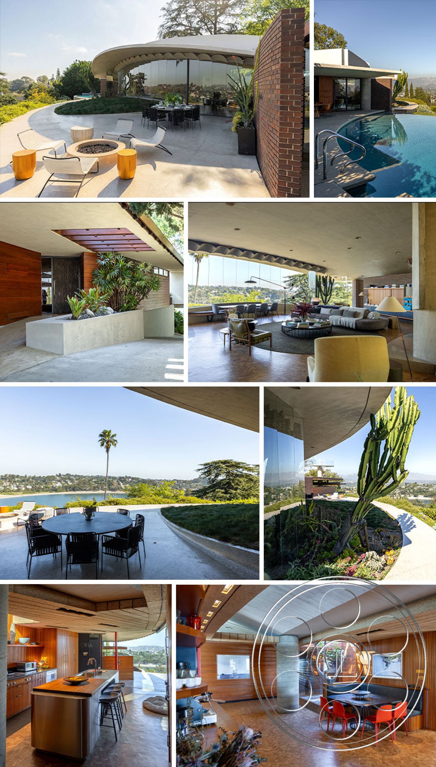 Silvertop House, designed with the distinct principles of mid-century modern architecture, features an open layout that fosters a free-flowing interaction between indoor and outdoor spaces. Inside, the expansive living area is framed by large windows that showcase spectacular views of the Silver Lake reservoir and the vibrant city beyond. Architectural highlights include elegant curved wooden ceilings, polished cork flooring, and a fireplace set within a natural stone backdrop, all of which add to the home's intriguing character.